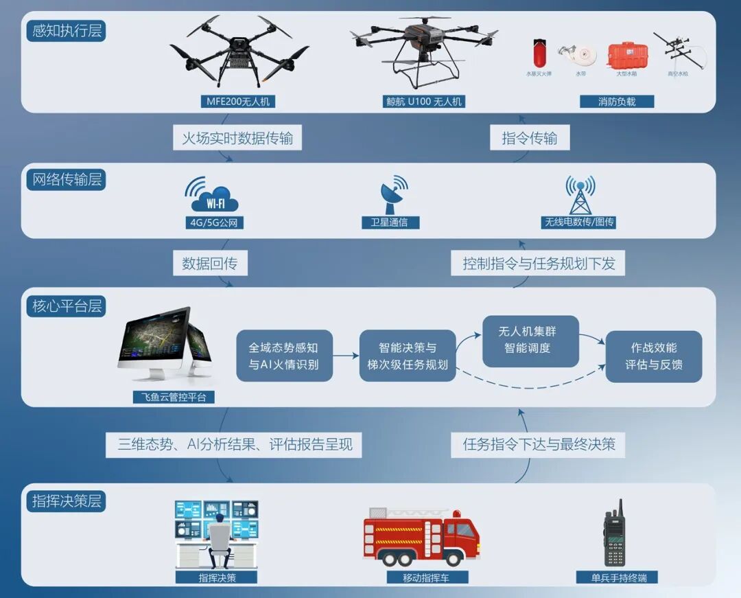 系统基于四层架构的消防智能指挥系统,通过感知执行层的 MFE200 无人机、 鲸航 U100 无人机及消防负载,实现火场实时数据采集与指令执行;借助网络传输层的 4G/5G 公网、卫星通信、无线数据链,完成数据回传与控制指令下发;以核心平台层的飞鱼云管控平台为中枢,开展全域态势感知、AI 火情识别、智能决策规划、无人机集群调度及作战效能评估;通过指挥决策层的指挥终端、移动指挥车、单兵手持终端,实现任务指令下达与最终决策。